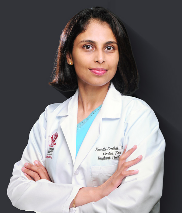 Dr. Keerthi Senthil has been practicing dentistry for the past 26 years. She has a Masters in the field of Oral Implantology from Loma Linda University. She is board certified and is one of the 445 dentists who have been credentialed with a Diplomate status in the field of Oral Implantology. She is also a Fellow of the American Academy of Implant Dentistry.